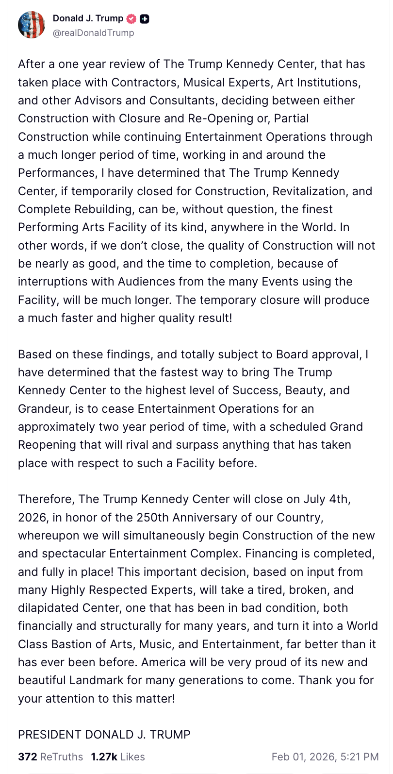Therefore, The Trump Kennedy Center will close on July 4th, 2026, in honor of the 250th Anniversary of our Country, whereupon we will simultaneously begin Construction of the new and spectacular Entertainment Complex. Financing is completed, and fully in place!