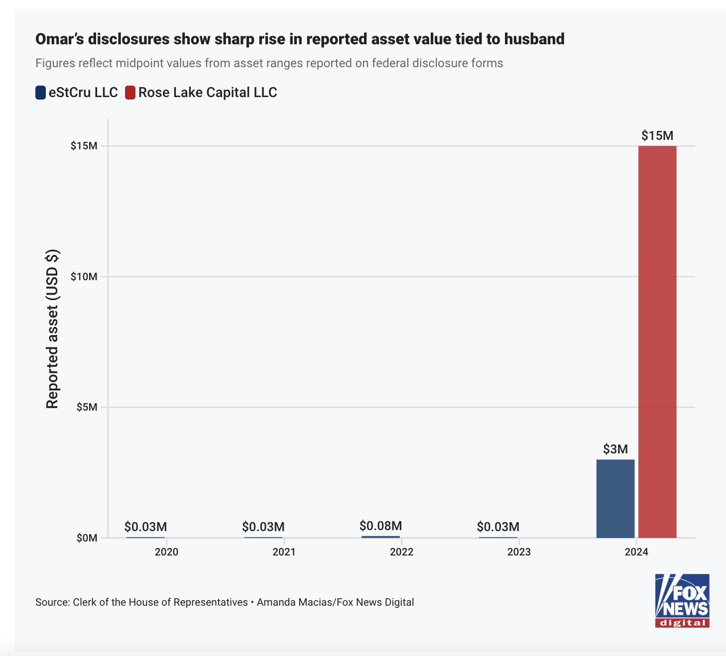 SUDDEN WEALTH: Federal disclosures reveal Omar’s husband’s business holdings surged to millions in 2024, contradicting her public denials of being a millionaire. Trump demands DOJ probe into the couple’s finances. https://t.co/RHFu3UUTU7