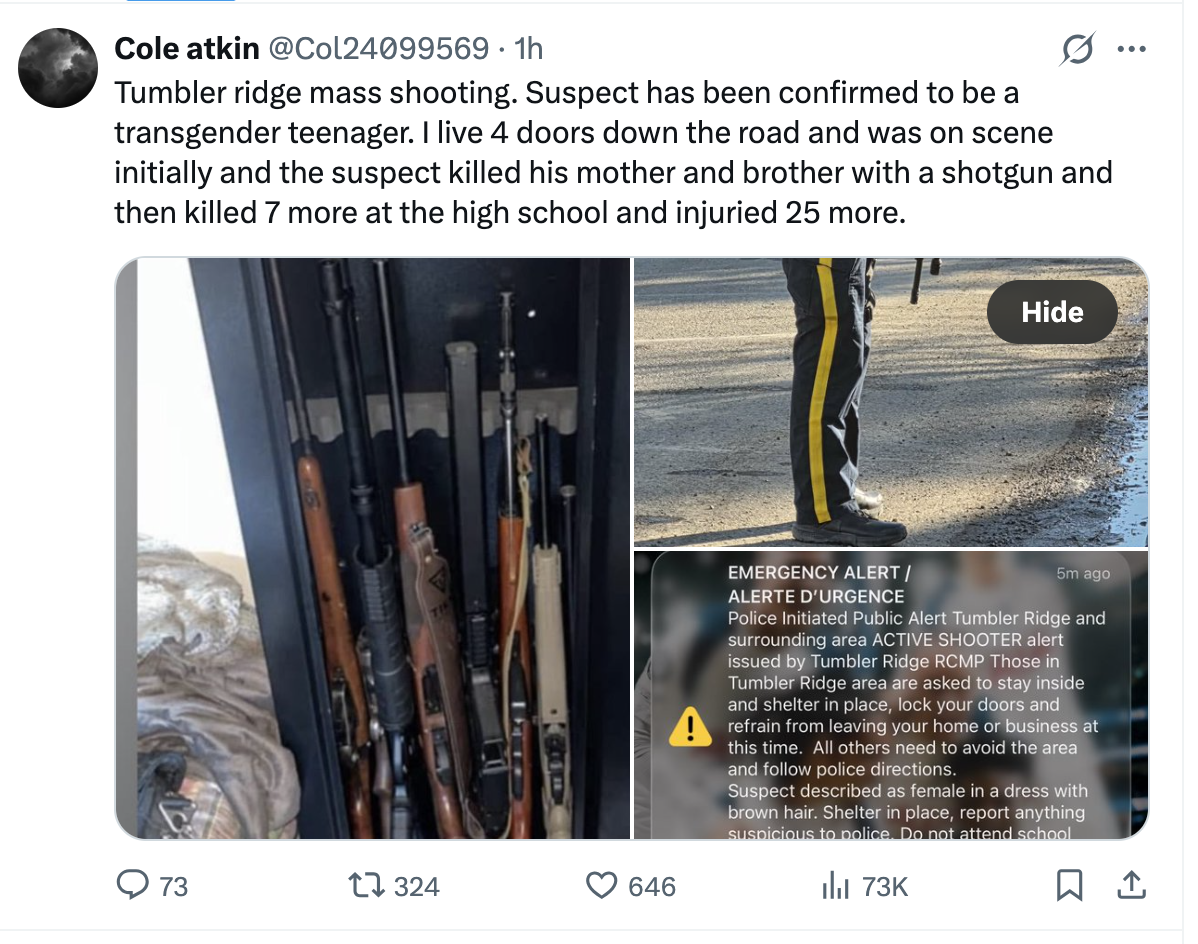X user Cole Atkin also commented on the shooting, writing on X, “Tumbler Ridge mass shooting. Suspect has been confirmed to be a transgender teenager. I live 4 doors down the road and was on scene initially and the suspect killed his mother and brother with a shotgun and then killed 7 more at the high school and injured 25 more.”