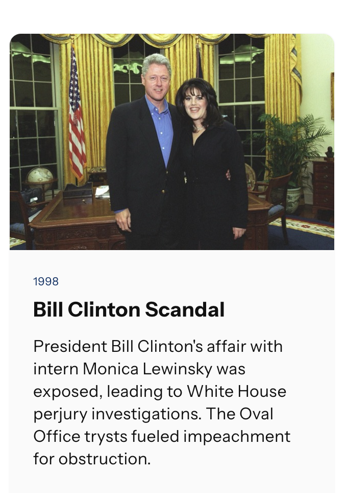 The timeline, which mostly chronicles major construction projects, now includes entries referencing “President Bill Clinton’s affair with intern Monica Lewinsky,” exposed in 1998, and controversial events hosted while Democratic Presidents Barack Obama and Joe Biden were in office.