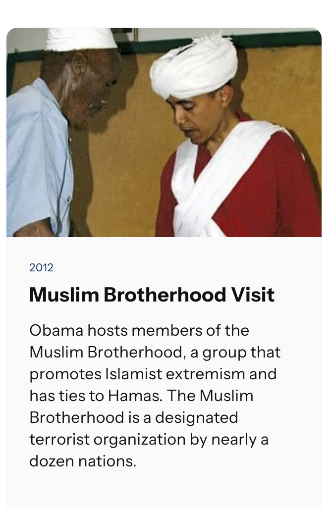 The entry reads: “Obama hosts members of the Muslim Brotherhood, a group that promotes Islamist extremism and has ties to Hamas. The Muslim Brotherhood is a designated terrorist organization by nearly a dozen nations.”