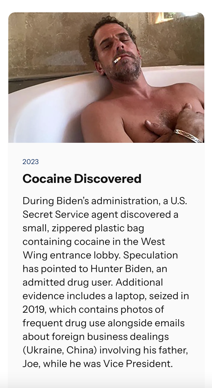 Under “Cocaine Discovered,” the entry reads: “During Biden’s administration, a U.S. Secret Service agent discovered a small, zippered plastic bag containing cocaine in the West Wing entrance lobby. Speculation has pointed to Hunter Biden, an admitted drug user. Additional evidence includes a laptop, seized in 2019, which contains photos of frequent drug use alongside emails about foreign business dealings (Ukraine, China) involving his father, Joe, while he was Vice President.”