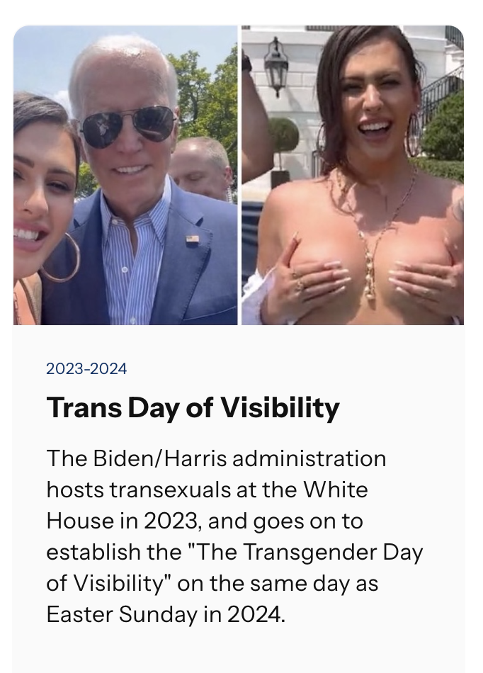 The entry reads: “The Biden/Harris administration hosts transexuals at the White House in 2023, and goes on to establish the “The Transgender Day of Visibility” on the same day as Easter Sunday in 2024.”